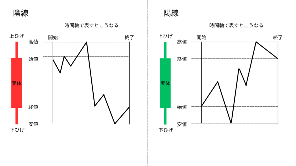 ローソク足には「陽線(ようせん)」と「陰線(いんせん)」があります。