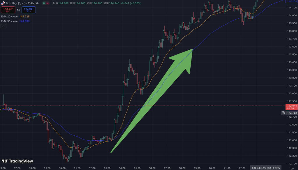 - 緑の陽線が続いている → 買い(上昇)の流れ
